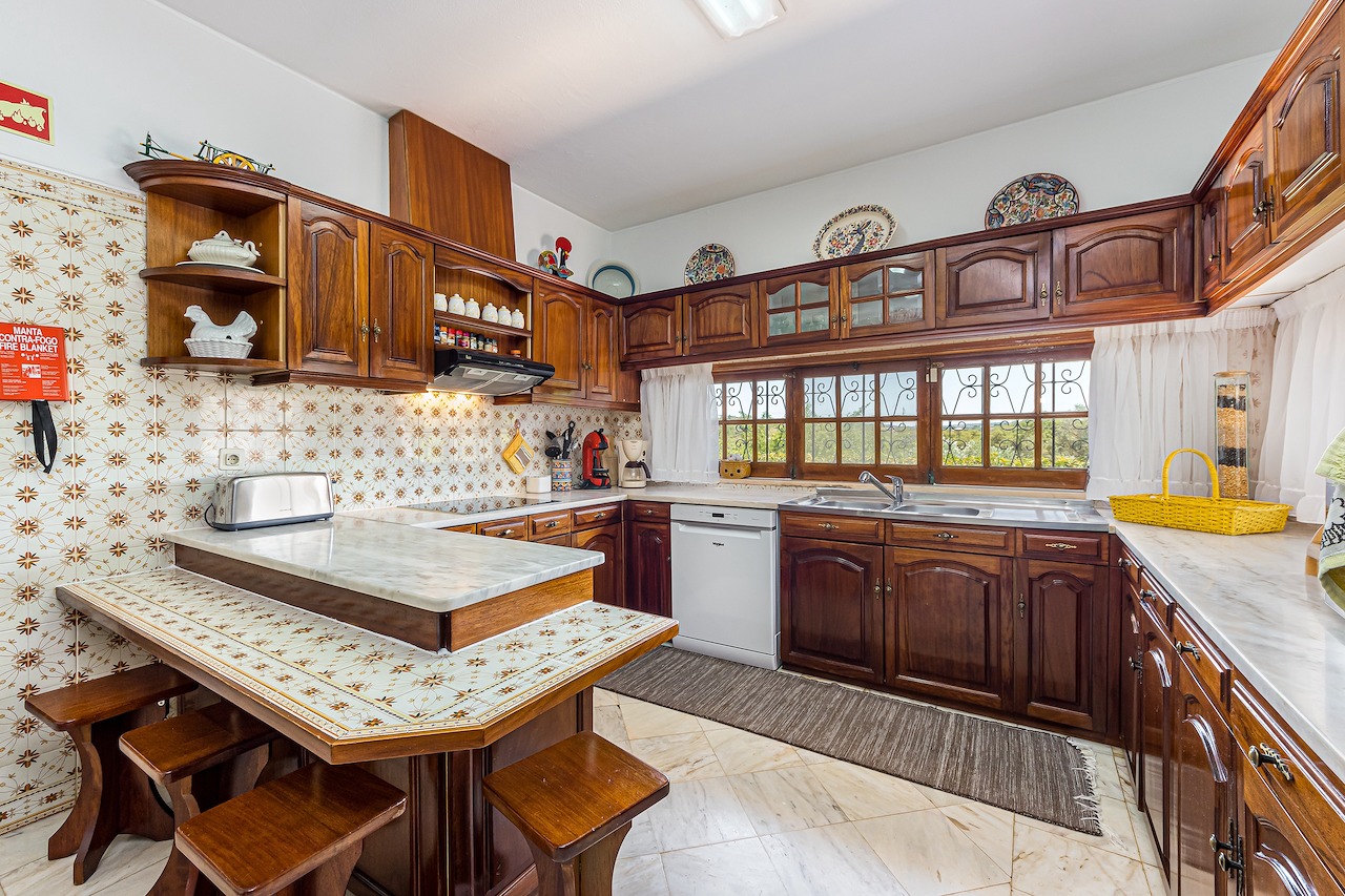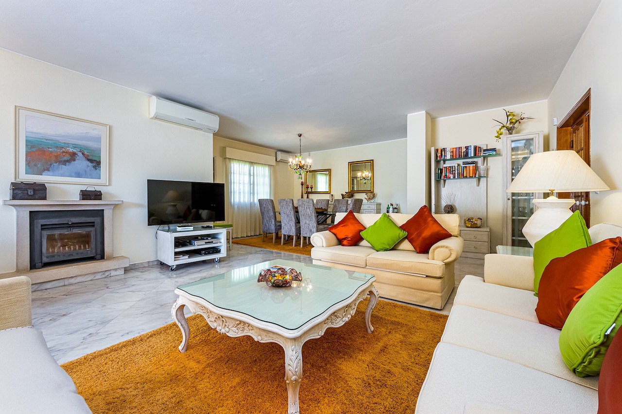 This beautifully furnished and spacious house is fully air-conditioned and consists of a large, bright sitting/dining room with satellite TV, DVD and a large stock of DVD films, feature fireplace and card table. Patio doors open onto a covered dining terrace with barbecue, which overlooks the pool and garden. Separate fully equipped fitted kitchen with dishwasher, fridge/freezer in the pantry and microwave and door to barbeque outside. Laundry room with two washing machines, ironing machine and another fridge/freezer.