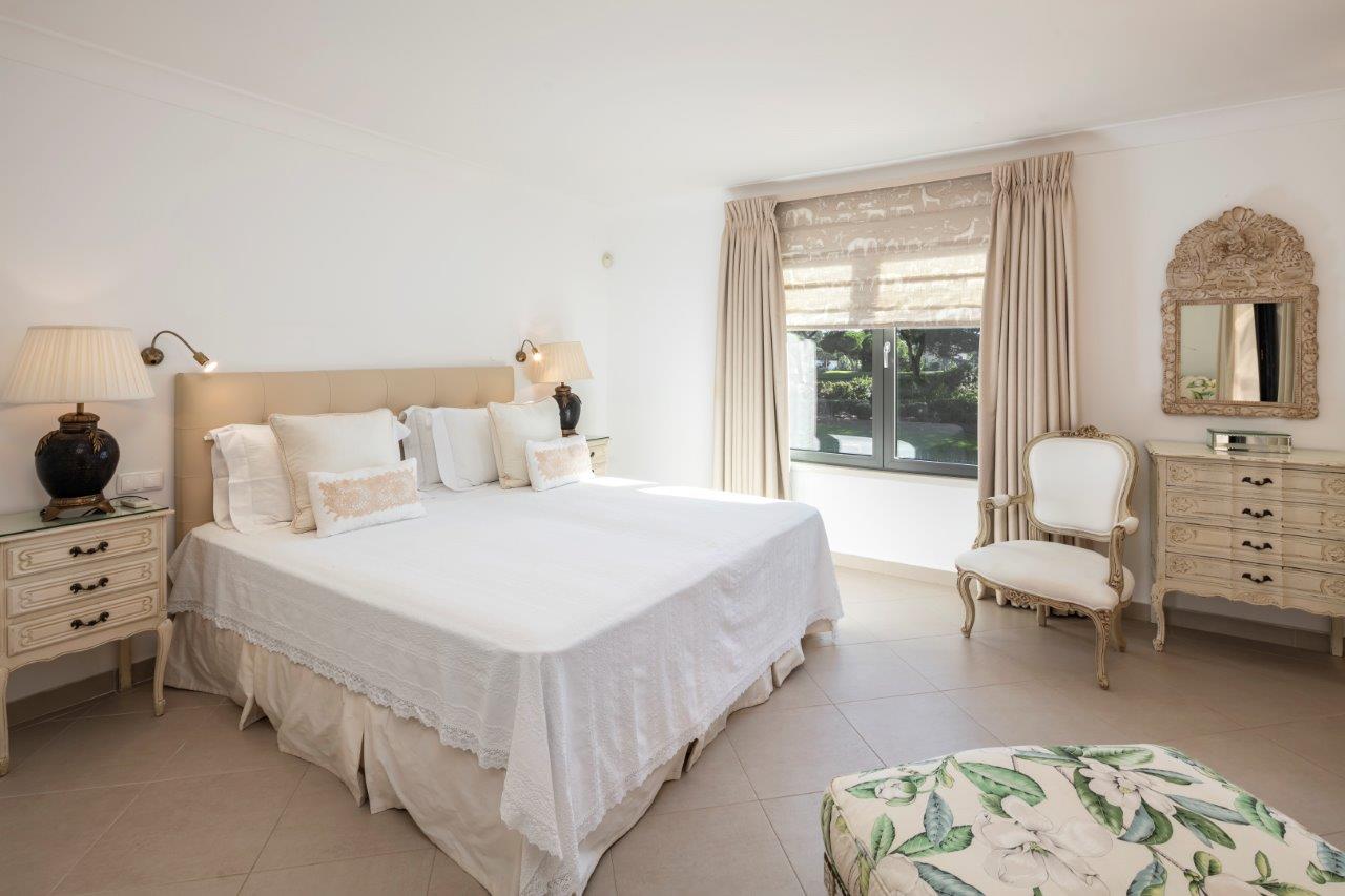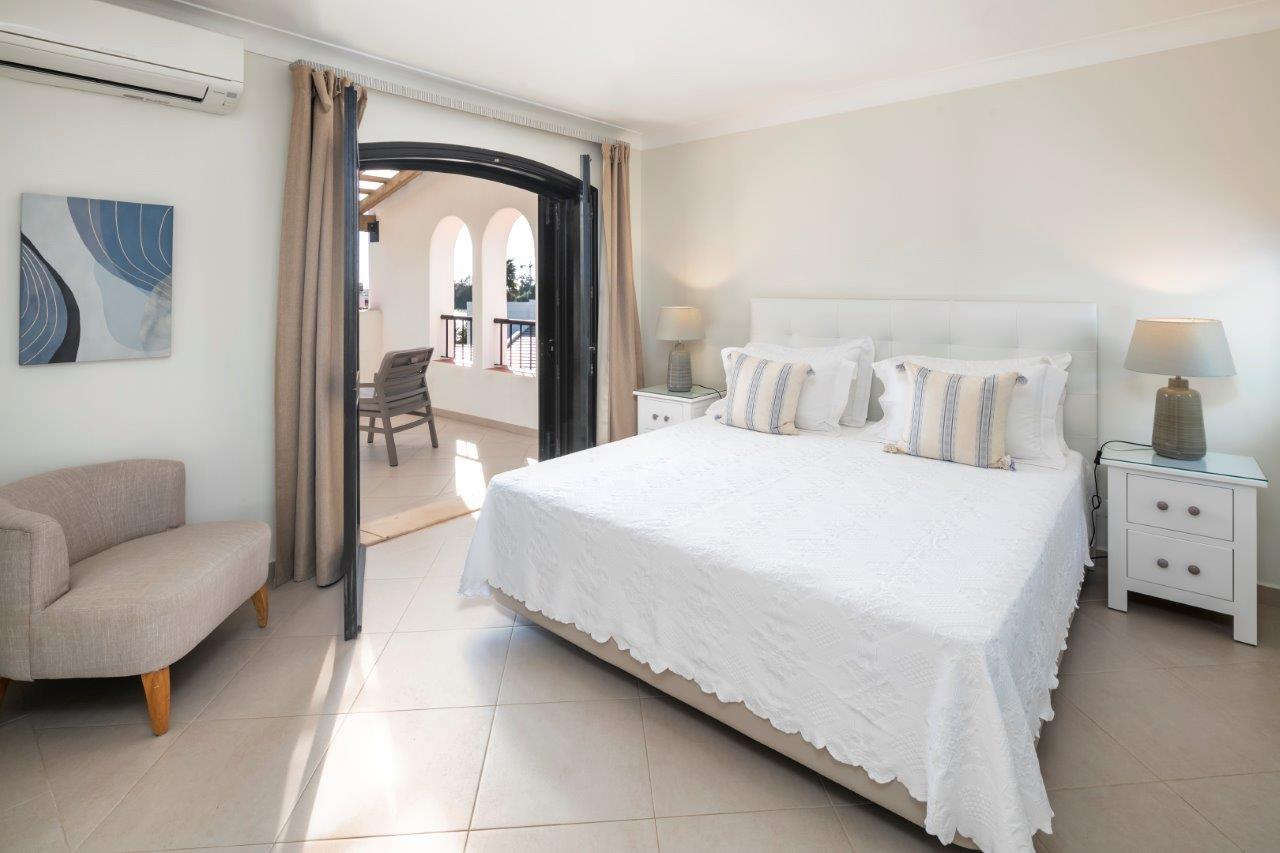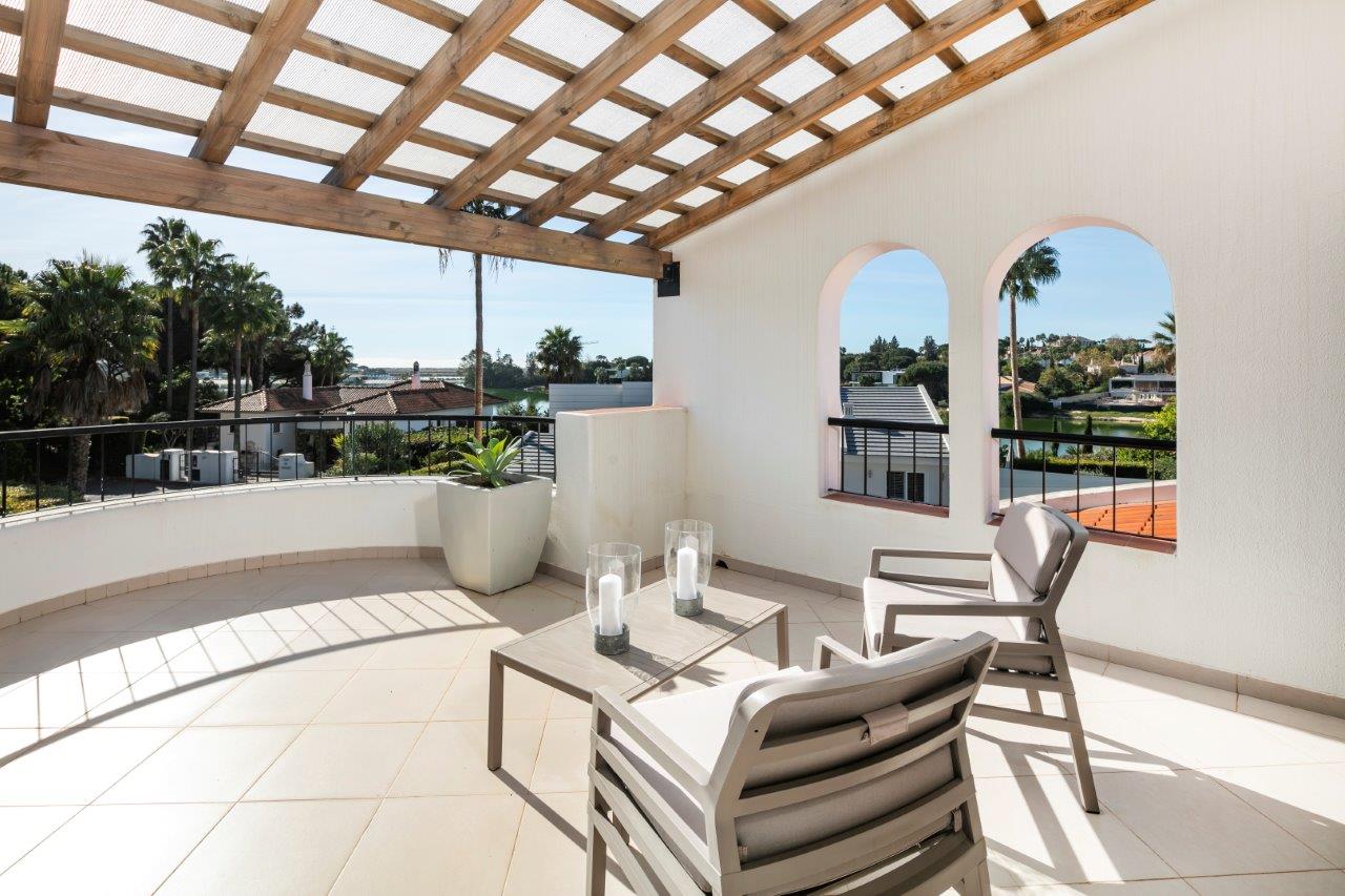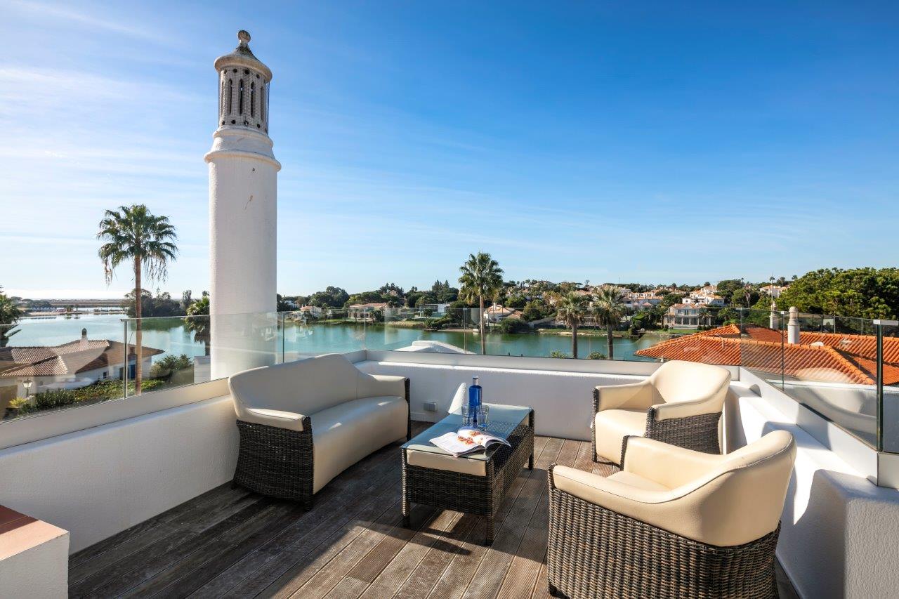 A staircase inside the villa leads up to the roof terrace, where rattan seating provides an inviting spot to sit back and admire the impressive views of the Quinta do Lago lake.