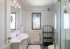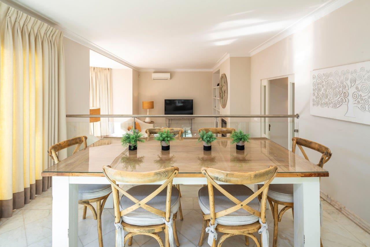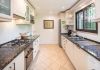The sleek, modern kitchen comes fully fitted with an extensive selection of appliances, including a refrigerator, washing machine, dishwasher, three gas burners plus one electric hob, extractor fan, toaster, kettle, Nespresso machine, ice maker, juicer, blender, and microwave. A freezer and tumble dryer are situated in the separate annex. A sliding door links the kitchen to the dining area, which seats six and opens directly onto the pool terrace.