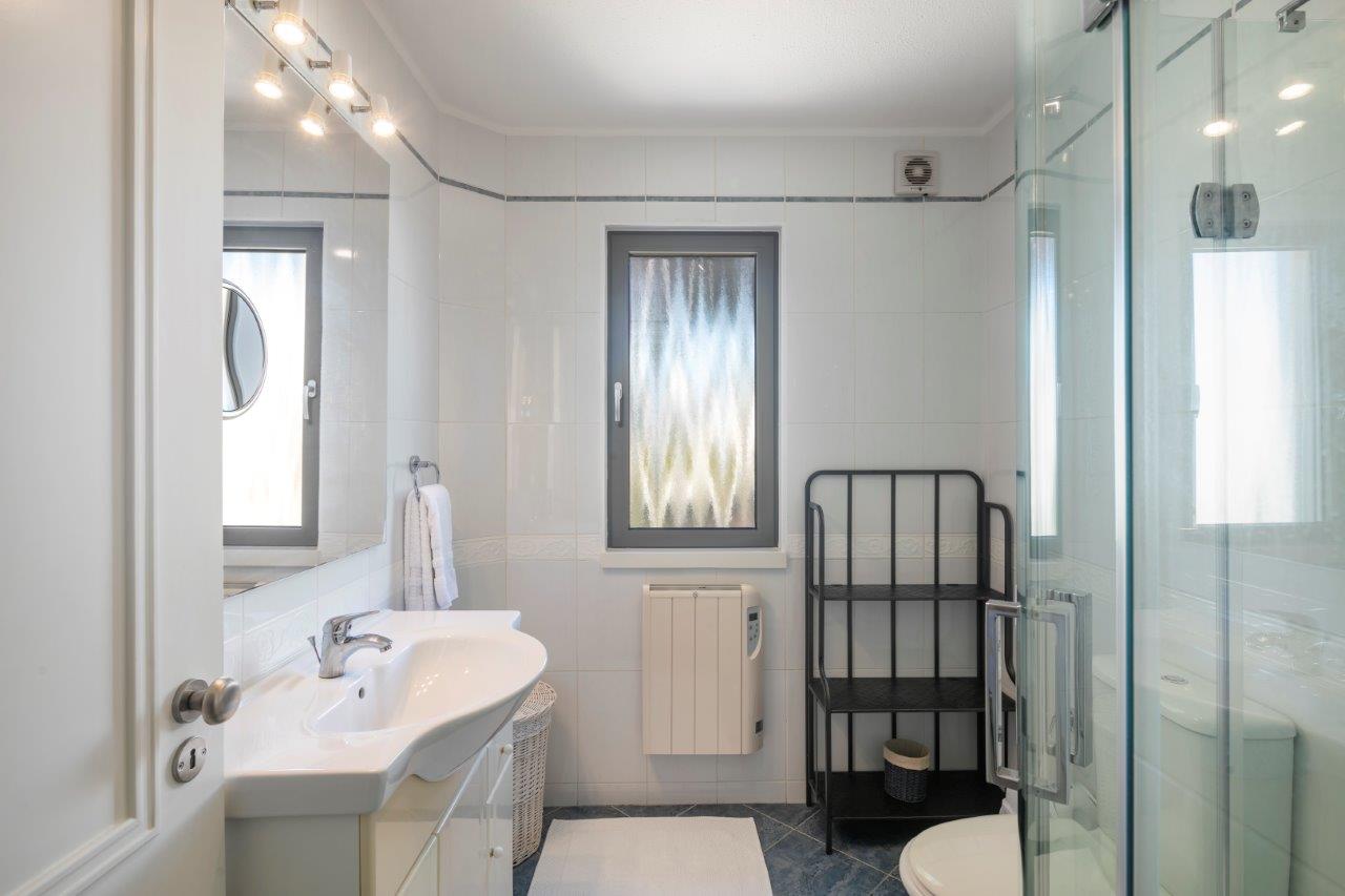 A short flight of steps from the entrance leads down to the living room, furnished with comfortable sofas, a feature fireplace, split-unit air conditioning, and a large flat-screen TV offering numerous English channels such as BBC, ITV, Sky Sports and TNT Sports. Glass doors provide direct access to the pool terrace and garden. Also on the entrance level is the first bedroom - a double room with air-conditioning, fitted wardrobes, and use of a separate shower room equipped with a heated towel rail.