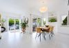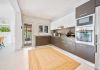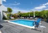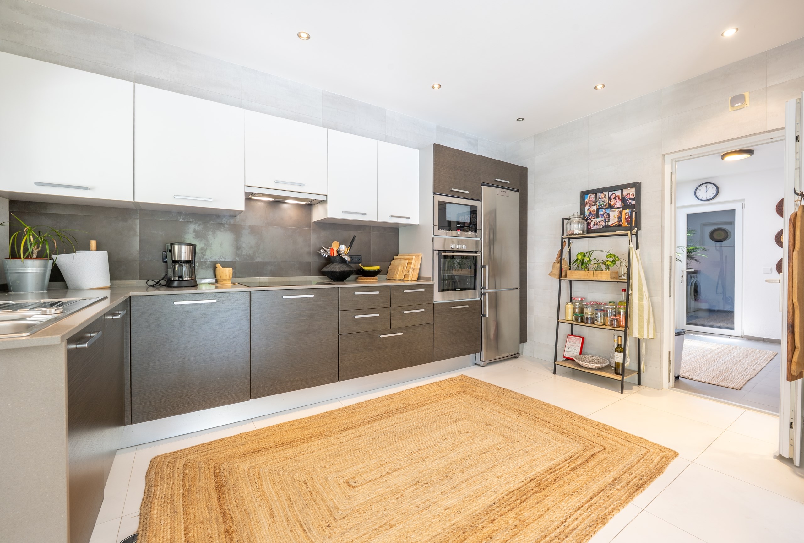 The entrance hall leads to a stylish guest toilet and a spacious open-plan living and dining area overlooking the garden and private pool. The modern, fully equipped kitchen is complemented by a separate, spacious laundry room.
