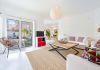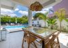 The master bedroom features built-in wardrobes, an en-suite bathroom and a private terrace with views of the garden and pool.