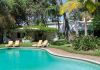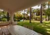 A beautiful exterior with huge spacious and impressive grounds, tall mature umbrella pines, established tropical plants and flowers and a perfect lawn that surrounds a large inviting swimming pool.