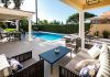 The rectangular shape swimming pool measures approximately 7,8m x 3,5m and can be heated upon request at an extra charge. Here you can also find comfortable sun loungers and a parasol to make the most of your days in the sun.