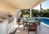 Through the French windows from the lounge / dining area, you will reach the pool terrace with a small lawned garden. Here you will find a seating space ideal to relax and enjoy an alfresco meals or cocktails and two different covered dining areas, one of which is below the covered gas BBQ terrace.