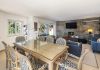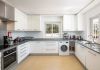 The ground floor boasts a bright, open-plan living and dining area with two comfortable sofas, a dining table for eight, and a 42” wall-mounted TV with satellite channels, DVD player, and docking station. The modern kitchen is fully equipped with a cooker, hob, built-in microwave, dishwasher, washing machine, and a breakfast bar for casual dining.